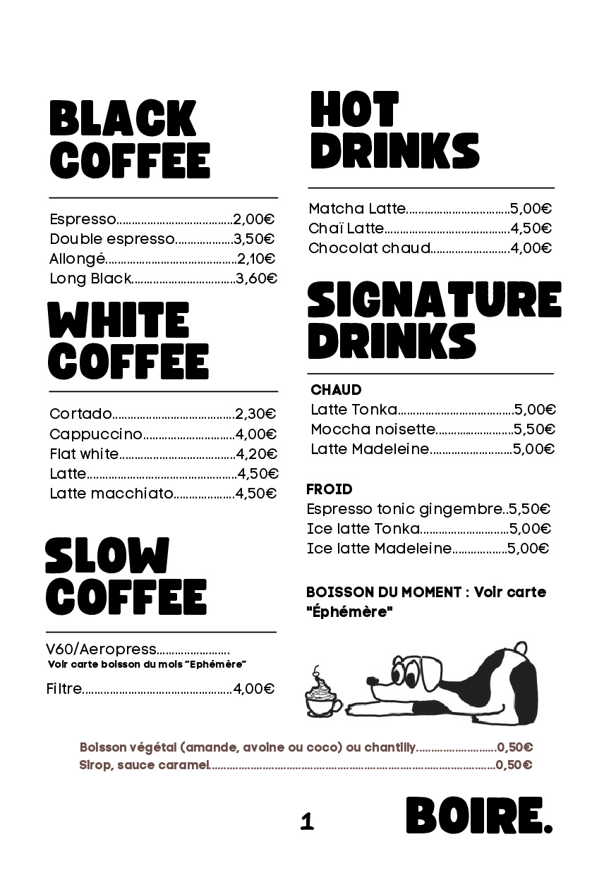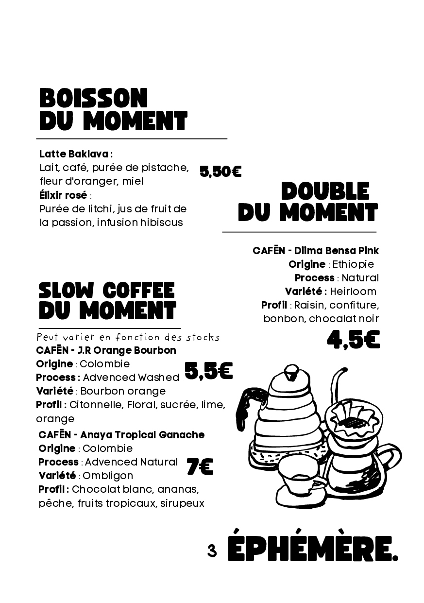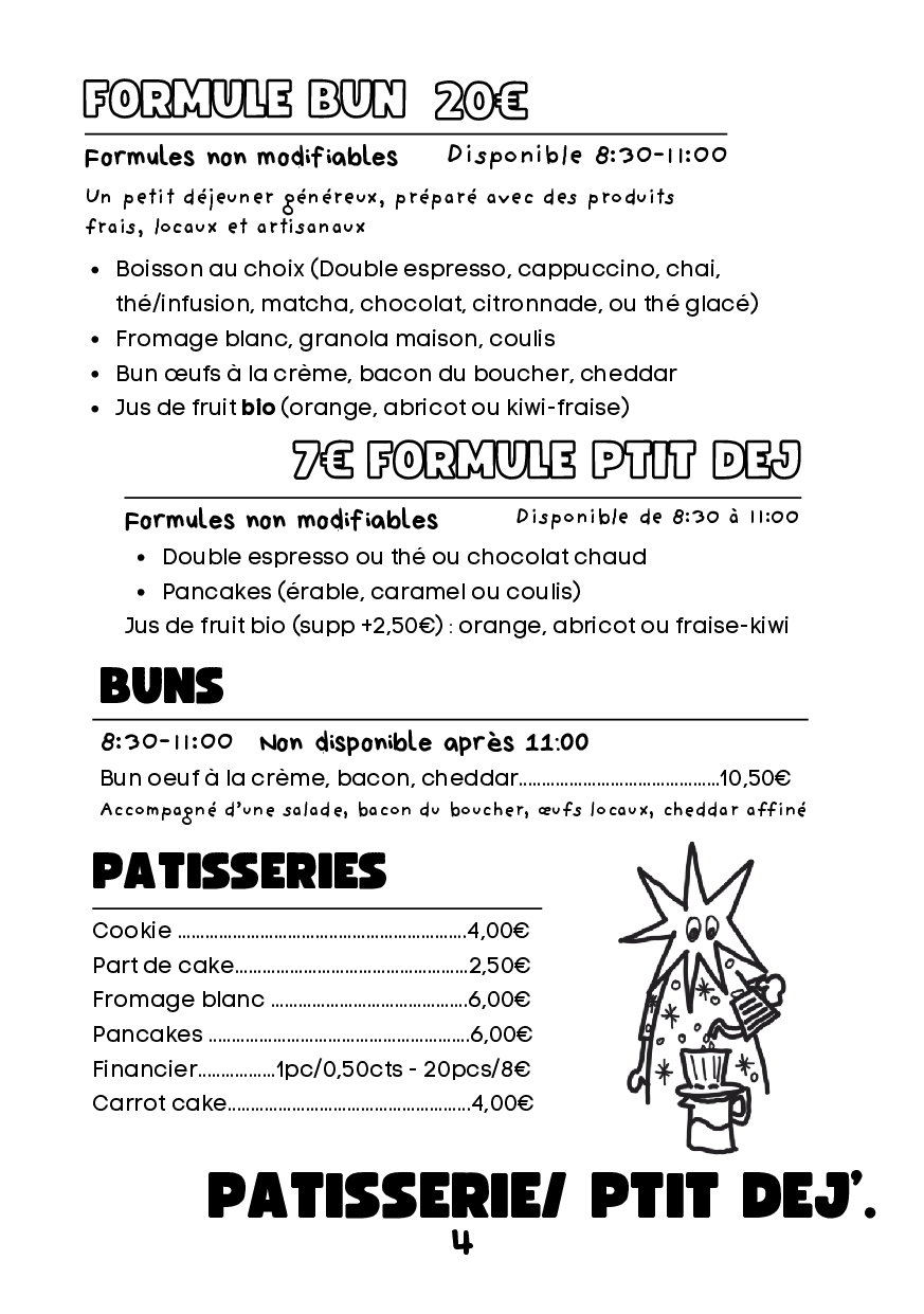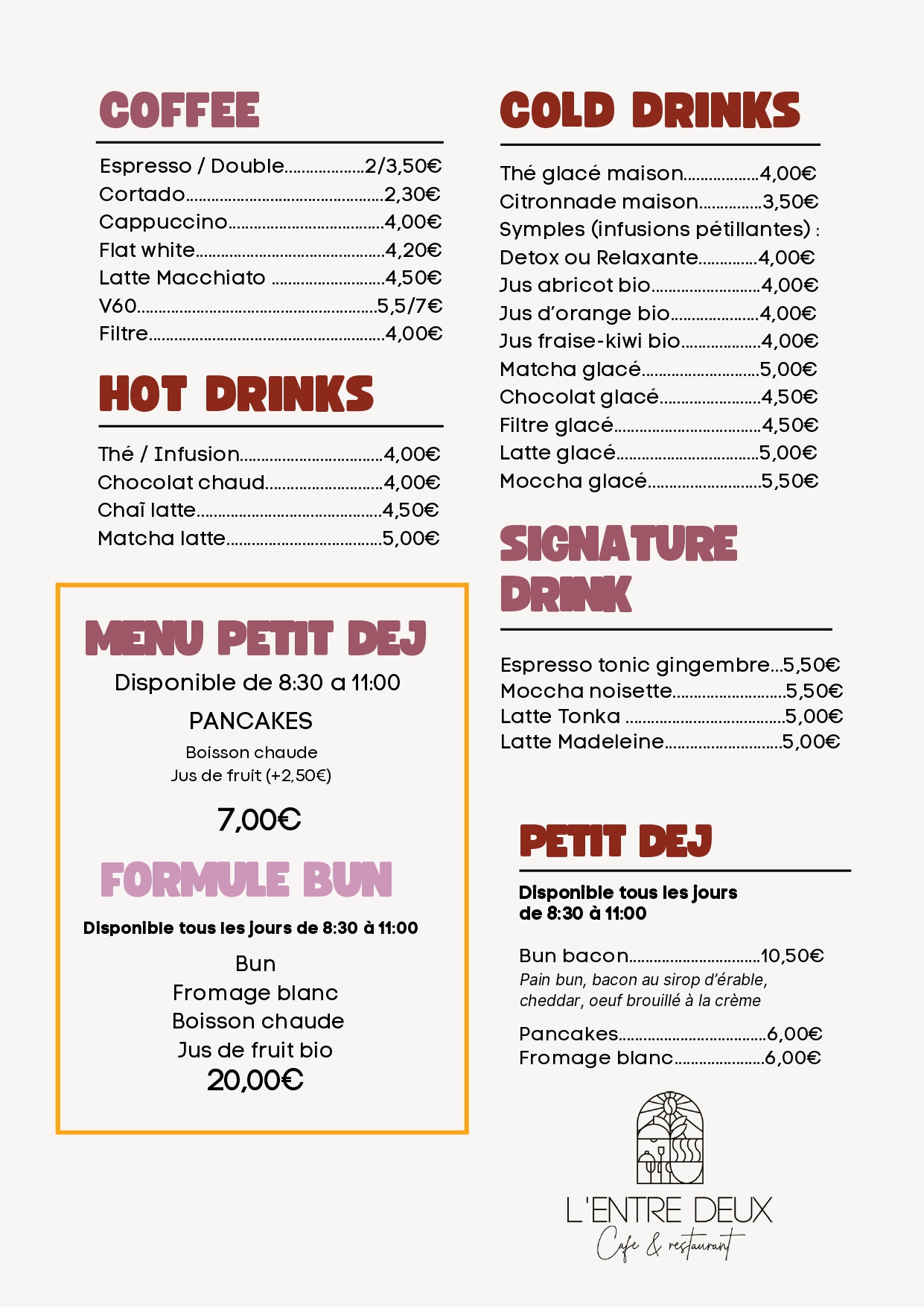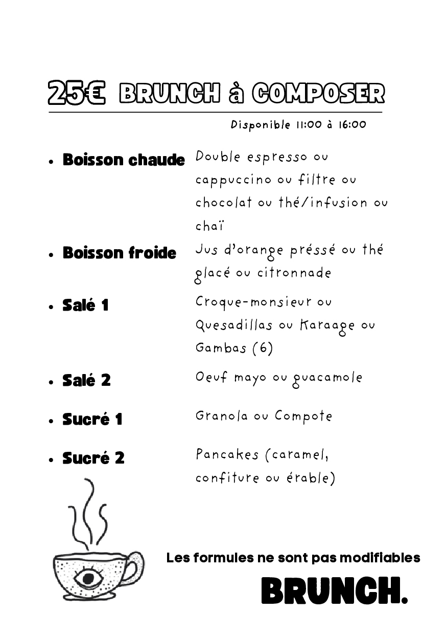 Formule petit dej à 7€ avec au choix un double espresso, un thé ou un chocolat chaud, pour démarrer la journée du bon côté. Des pancakes tout chauds viennent avec, garnis selon ton envie : érable, caramel ou coulis. Tu peux ajouter un jus de fruit bio (+2,50€) parmi orange, abricot ou fraise-kiwi. Disponible de 8:30 à 11:00, après ça, on appelle ça la survie, pas le petit déjeuner.